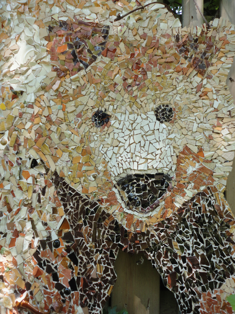 Mosaic wall on the veggie garden in our backyardHouse starBlack Cat mosaic table on the back porchBlack Cat mosaic porch table includes odds and endsMosaic wildlife in our backyard includes this grizzly bear!Garden mosaics just feel right no matter what!