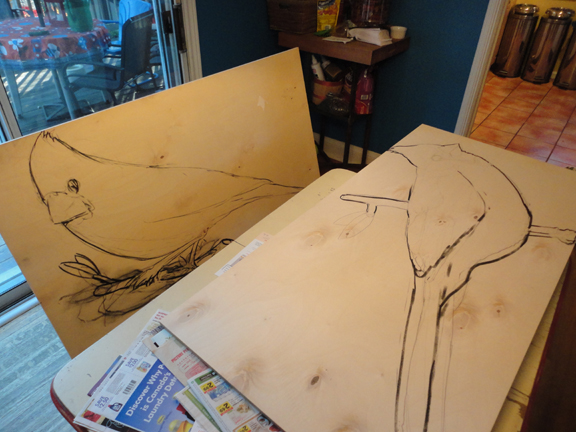 Cardinals – the shapes We’re using birch plywood as ground for the cardinals. After taking this picture, we painted the sides and back with a good exterior latex to protect them from water.