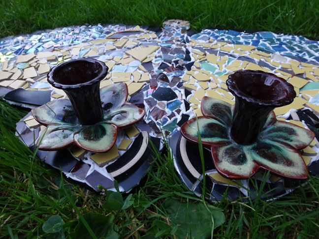 We make all kinds of indoor or outdoor work in all sizes and themes, including birds, butterflies and bears as well as large granite benches. Materials range from broken crockery and found objects to Italian smalti (glass) tiles. Prices vary depending on size, complexity and materials. Each project is a one of a kind work of art. We would love to make something special for your home.
