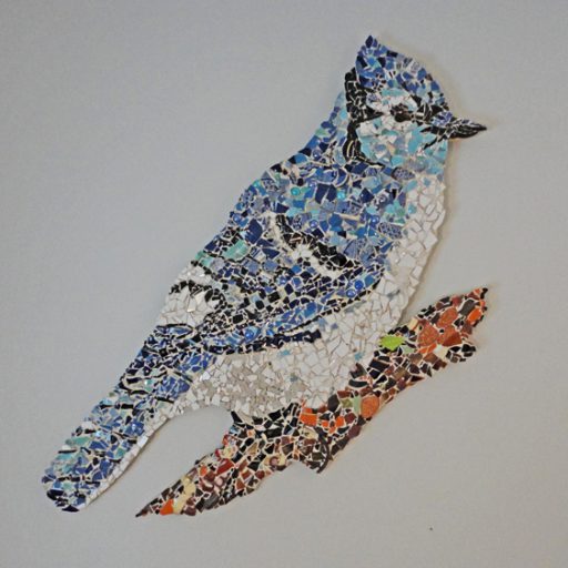 This was one of our first commissions and our first jay. This mosaic is close to four feet tall. It’s made with an assortment of tiles, broken crockery, bits of glass and stone.