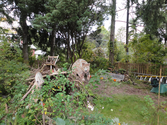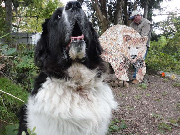 This large-scale exterior grizzly bear project is about 5 feet all and 4 feet wide. It has recently been installed at a home in Paris Ontario. It lives along the back wall of a house, in a garden area, overlooking a pool. This mosaic was installed in the fall and sits above the ground to accommodate garden growth.
